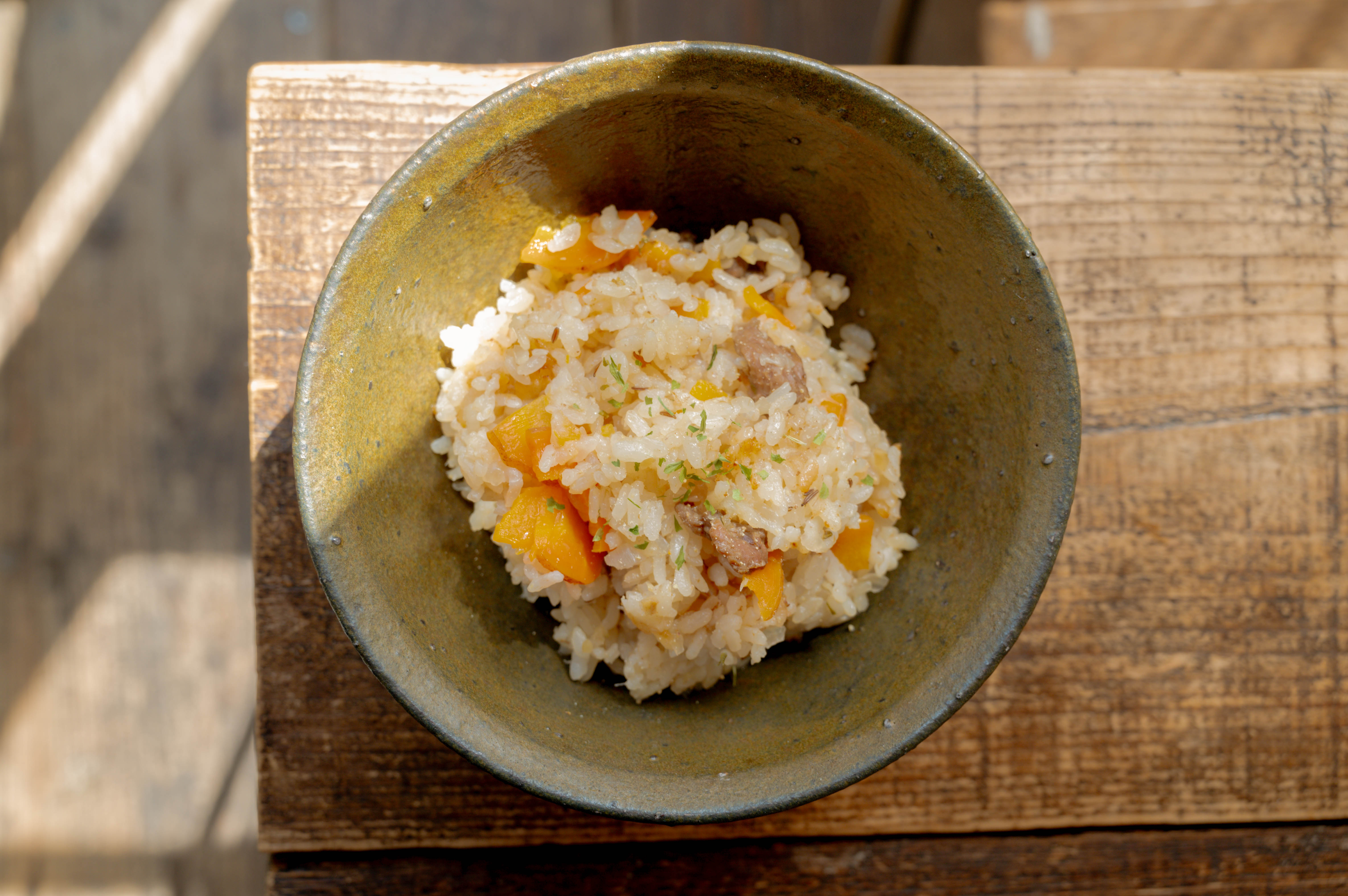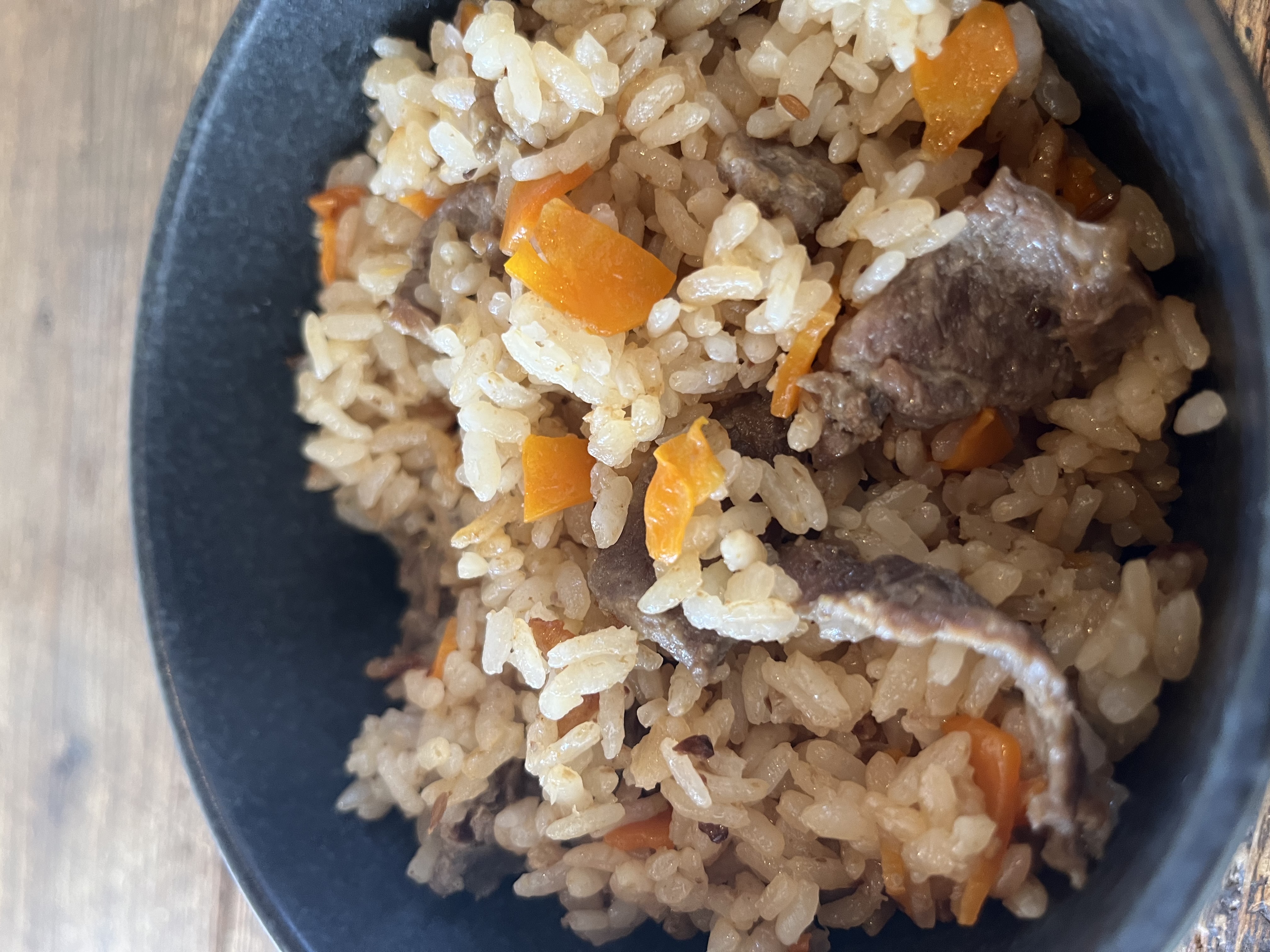 羊肉を玉葱と醤油醪に漬け込み、野菜と一緒に炊き込みました。